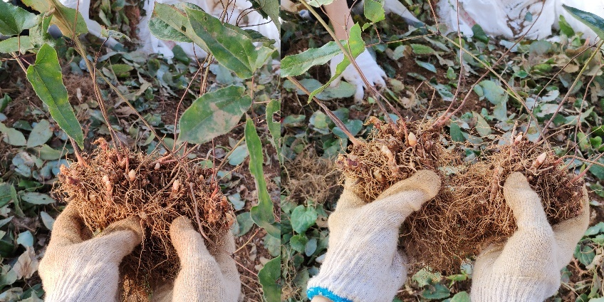 通過對采挖的淫羊藿種苗進(jìn)行觀察,分蘗芽多且飽滿,證實此地適宜淫羊藿的種植。在項目組成員和當(dāng)?shù)厮庌r(nóng)的共同努力下,兩天完成了約三畝淫羊藿種苗的采挖工作。