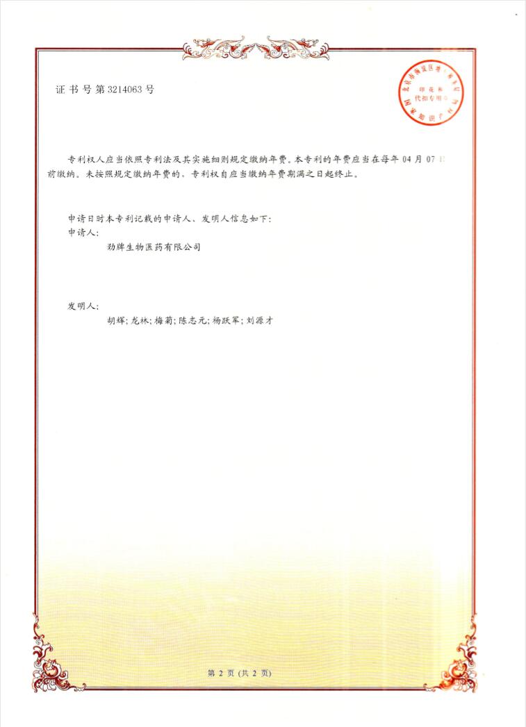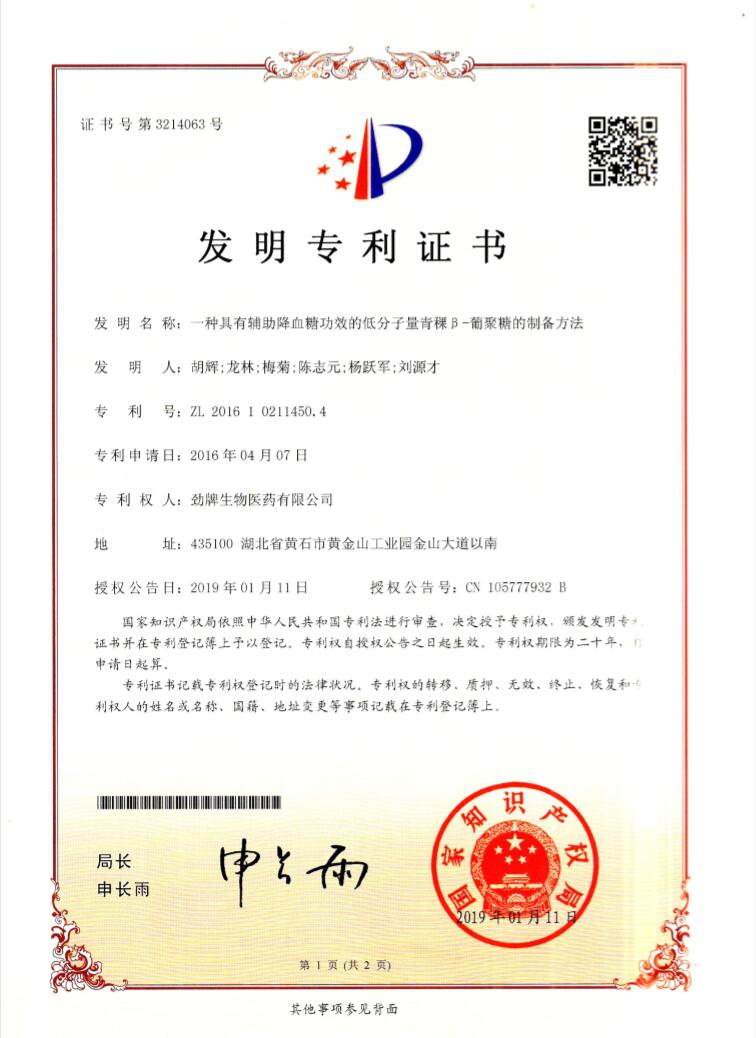 1月11日,由胡輝、龍林、梅菊、陳志元、楊躍軍、劉源才6人提出的《一種具有輔助降血糖功效的低分子量青稞β-葡聚糖的制備方法》獲得發(fā)明專(zhuān)利。該專(zhuān)利為勁牌公司2019年自然年度獲批的第一項(xiàng)發(fā)明專(zhuān)利。