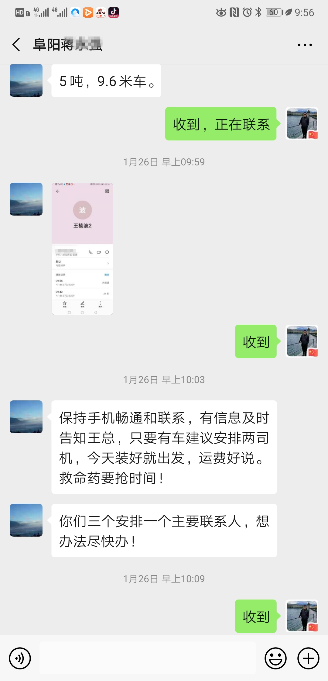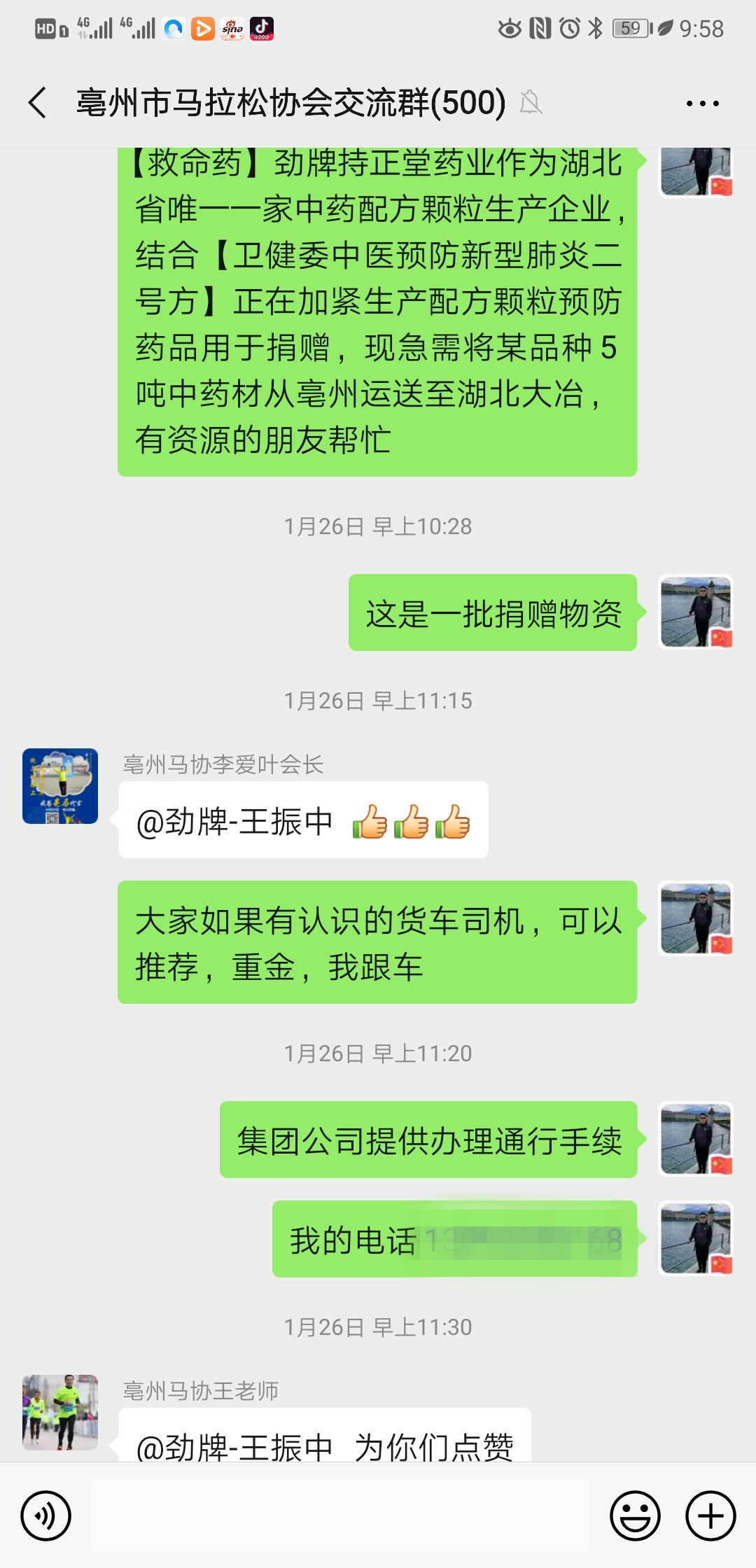 我還聽(tīng)說(shuō),為了這次藥材采購(gòu),勁牌人非常拼!在找車(chē)、找司機(jī)上協(xié)調(diào)了很多資源。勁牌公司常務(wù)副總裁王楠波親自協(xié)調(diào)安徽阜陽(yáng)、亳州的經(jīng)銷(xiāo)商和營(yíng)銷(xiāo)人員,協(xié)助尋找物流資源。安徽亳州保健酒經(jīng)銷(xiāo)商趙總、白酒經(jīng)銷(xiāo)商南總,阜陽(yáng)總經(jīng)銷(xiāo)商蔣總、市場(chǎng)營(yíng)銷(xiāo)經(jīng)理丁雷、王振中行動(dòng)迅速,建立了專(zhuān)門(mén)的微信群,發(fā)動(dòng)親朋好友和員工,尋找合適的車(chē)輛和司機(jī)。大家翻遍了朋友圈內(nèi)貨運(yùn)行業(yè)從業(yè)朋友的信息,電話打了一個(gè)又一個(gè),各種微信交流群里分享找車(chē)信息。
