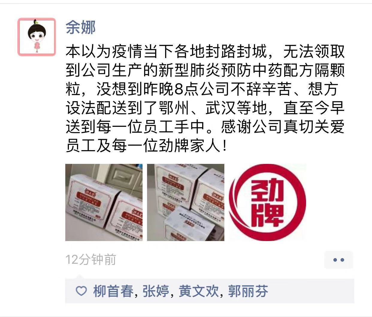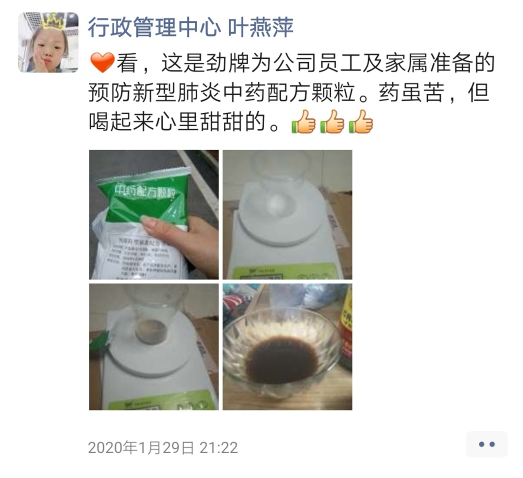 收到這份關愛多人,除了對公司滿懷的感恩,還有對背后生產者的傾情致敬。正如今日的頭條所說,正是我們這些一線生產者的日夜兼程,才有這一份份滿含愛心的中藥配方顆粒,被運送到所需要的四面八方,小小的一盒到底凝結了多少人的心血,我們每個勁牌人應該深深銘記。