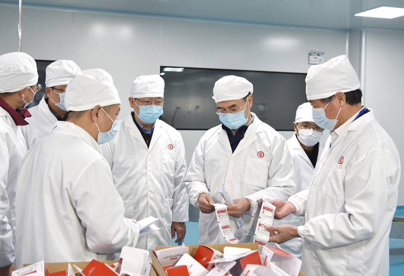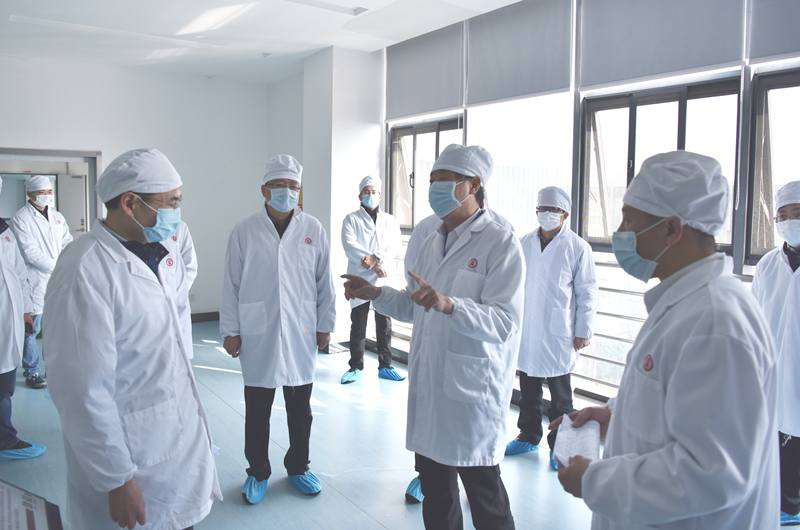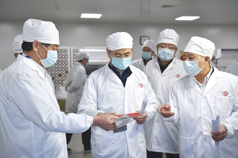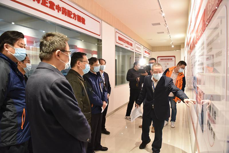 惠建林一行先后參觀了勁牌持正堂藥業(yè)國醫(yī)館、檢測實驗室、中藥提取一車間、中藥配方顆粒智慧藥房和中藥顆粒劑車間。參觀過程中,惠建林詳細(xì)詢問了用于新冠肺炎的中藥預(yù)防二號方、“清肺排毒湯”和“肺炎1號”治療方的生產(chǎn)情況,并對藥品配方、藥材檢測、生產(chǎn)設(shè)備、工藝流程等進(jìn)行了深入了解。