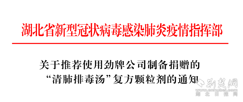 荊楚網(wǎng)客戶端—荊楚網(wǎng)消息(通訊員 王群)2月22日,湖北省新型冠狀病毒感染肺炎疫情指揮部下發(fā)通知文件,向全省推薦使用勁牌公司制備捐贈(zèng)的“清肺排毒湯”中藥配方顆粒,充分發(fā)揮中醫(yī)藥在新冠肺炎治療中的作用。